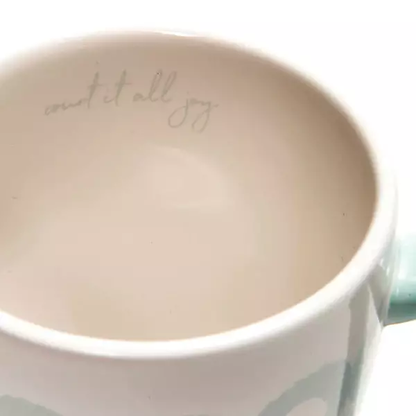 Nodig een vriend uit voor een kopje koffie met deze mooie mok. De woorden œCount it all joy geschreven aan de binnenkant met kalligrafisch lettertype zullen een bemoedigende uitspraak toevoegen aan je keuken en je gesprek.
