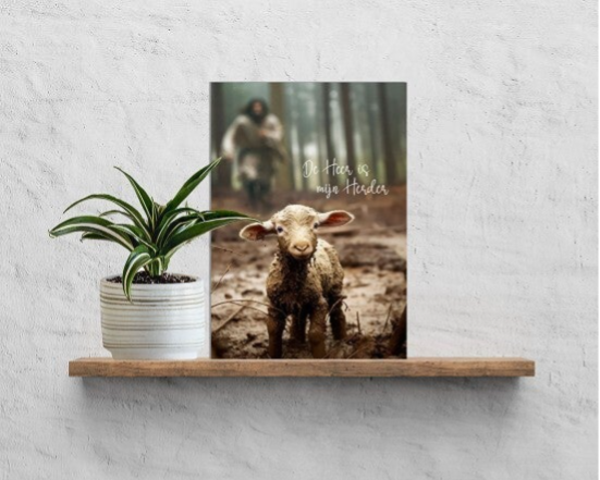 Plaat van plexiglas met de afbeelding van een lam met op de achtergrond een herder. Met de tekst: ‘De Heer is mijn Herder‘.