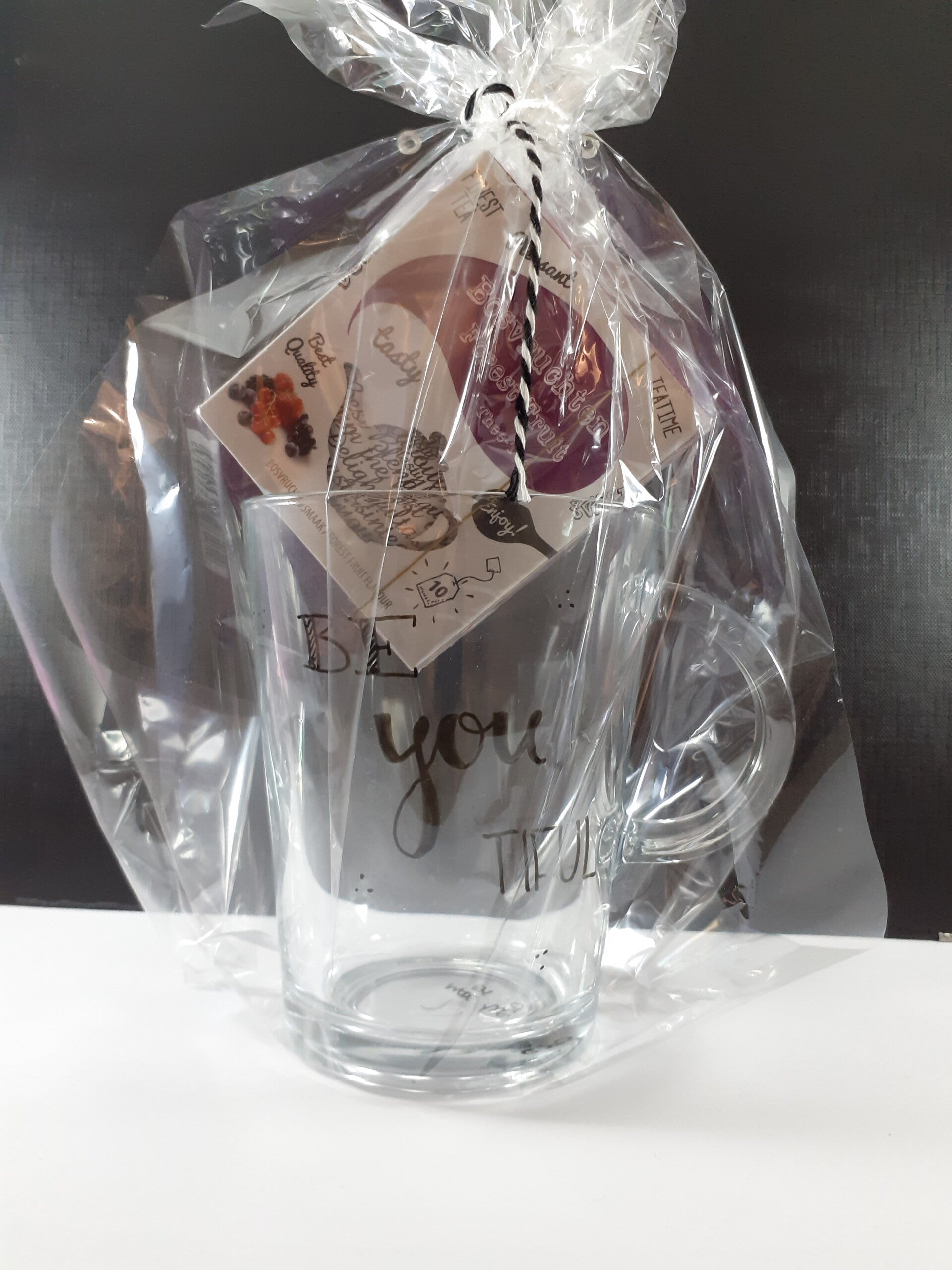 Drink jij je thee het liefst uit een glas? Koop dan nu een glas met een gave tekst en een doosje thee erbij.