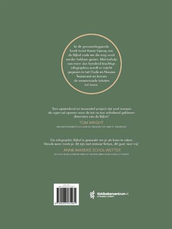 In 'De infographic Bijbel' van Karen Sawrey wordt de Bijbel getoond zoals je die nog nooit eerder hebt gezien: in infographics. In meer dan honderd illustraties wordt er inzicht gegeven in het Oude en Nieuwe Testament en komen eeuwenoude woorden tot leven. De schepping, de maten de ark van Noach, de rijkdom van koning Salomo, de parabels van Jezus, de reizen van Paulus: alle bekende personen en verhalen komen aan bod. Dit is de Bijbel voor een nieuwe generatie.