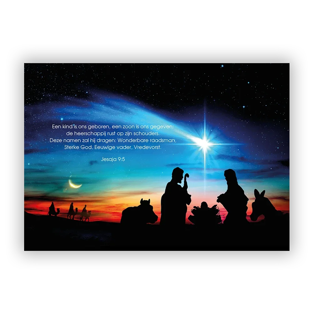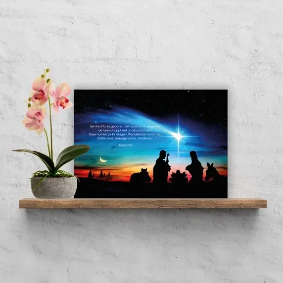 Duurzaam cadeaubord van plexiglas met afbeelding van een kerststal en de profetie over de Messias uit Jesaja 9:5-6.