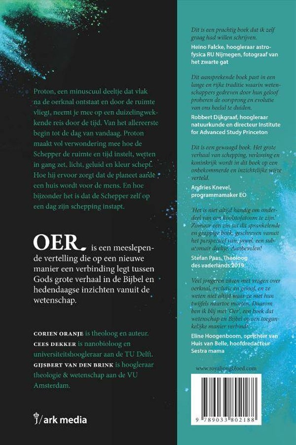 Oer begint met een fascinerende hervertelling van het scheppingsverhaal. Proton, een minuscuul deeltje dat vlak na de oerknal ontstaat en door de ruimte vliegt, neemt de lezer mee op een duizelingwekkende reis door de tijd, van oerknal tot de evolutie van het leven tot de dagen van Jezus en het leven van nu. Proton maakt vol verwondering mee hoe de Schepper de ruimte en tijd instelt, wetten in gang zet, licht schept, geluid en kleur. Hoe Hij ervoor zorgt dat de planeet aarde een veilig huis wordt voor de mens en hoe bijzonder het is dat God zelf op een dag in de persoon van Jezus zijn schepping instapt.