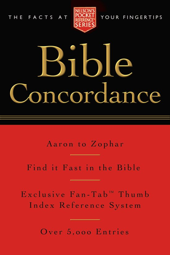 This pocket-size concordance is a handy, find-it-fast Bible reference tool. It is ideal for all Bible students and a must for every Bible owner, featuring the exclusive Fan-Tab Thumb index reference system.. Over 5,000 entries from Aaron to Zophar make this a comprehensive, compact, and convenient book for your briefcase or backpack. This concordance is part of the Nelson Pocket Reference Series. Useful with any Bible translation., Size 13.3x8.9cm