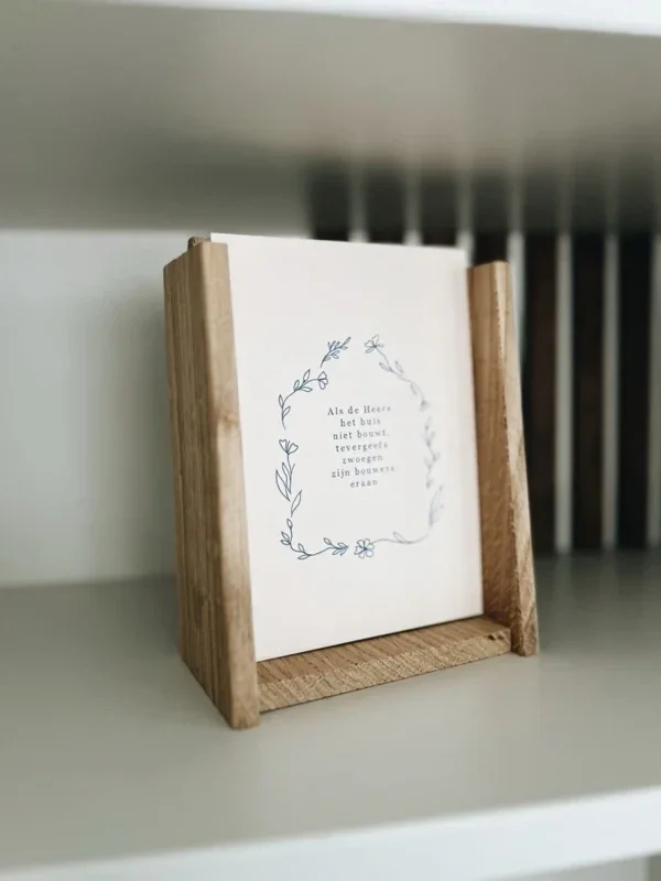 In deze eikenhouten staande houder past de hele set van 52 Bijbelkaarten in een jaar in.