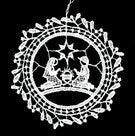 Kantklos ornamenten met diverse kerst taferelen. Ca 9cm hoog. Met hanglintje.