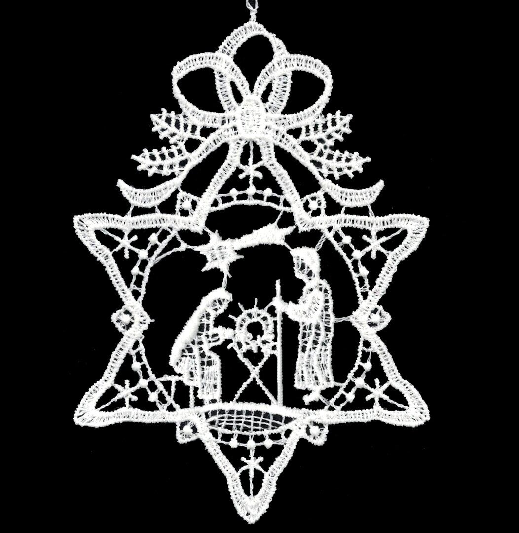 Kantklos ornamenten met diverse kerst taferelen. Ca 9cm hoog. Met hanglintje.