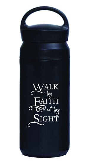 Thermosfles 'Walk by faith not by sight' Kleur fles: zwart. Opdruk: Wit. Blijft ca. 24 uur koud. Blijft ca. 12 uur warm. Inhoud: 450 ml Materiaal: SUS304 roestvrij staal Afmetingen: 7,1 x 16 cm
