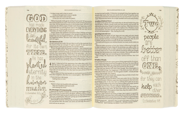 Inspire is a single-column, wide-margin New Living Translation Bible that will be a cherished resource for coloring and creative art journaling. It's the first Bible of its kind with over 400 beautiful line-art illustrations spread throughout the Bible. Full-page and partial-page Scripture art is attractively displayed throughout the Bible, and the illustrations can be colored in to make each Bible unique, colorful, and customizable. Every page of Scripture has two-inch-wide margins, with either Scripture line-art or ruled space for writing notes and reflections, or to draw and create. The generous 8.65-point font ensures optimal readability, and quality cream Bible paper is great for creative art journaling. Inspire is available in the popular New Living Translation, and is designed uniquely to appeal to art-journaling and adult coloring book enthusiasts.