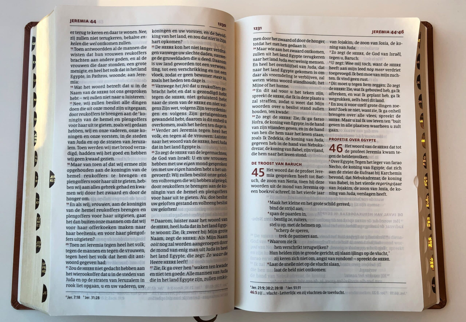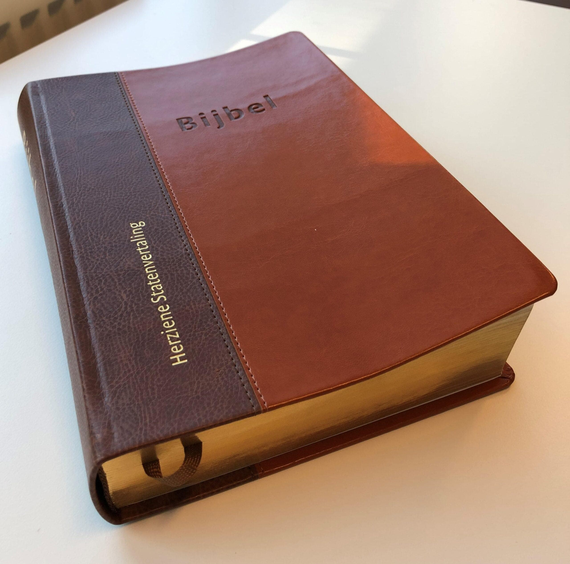 Huisbijbel in Herziene Statenvertaling met flexibele vivella (kunstleren) omslag, goudsnee en duimgrepen. Formaat: 16x24 cm
